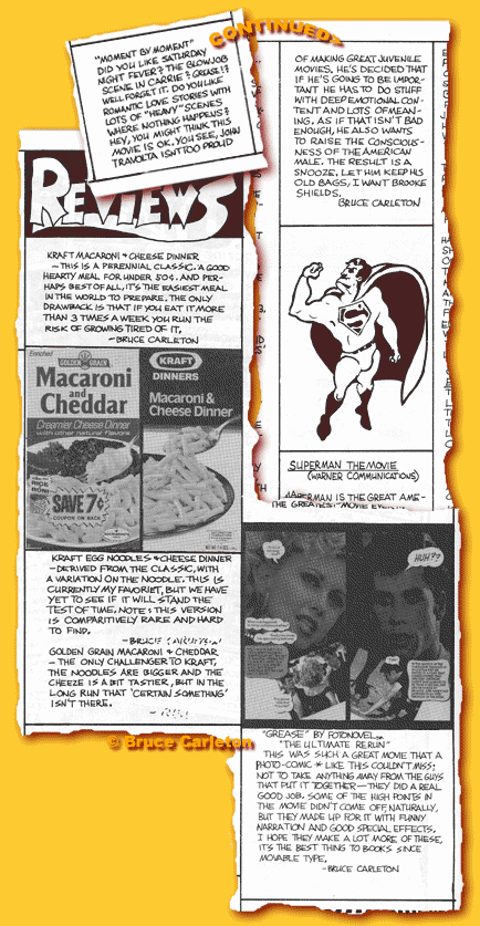 PUNK #16: Reviews Most of what I wrote way on back doesn't hold up very well, but I stand by the Mac & Cheese review even to this day. (For a follow-up, have a look at the review in Punk #0 HERE.) Note how the by-line fades away. I had penciled in the lettering and tried to skimp on writing out my name three times. The inker took it literally. The Superman illo went with John's review of the movie. |