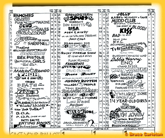Punk's Top 99 was its most popular running feature. (Its only running feature, in fact.) Readers voted for a few of their favorite things. In #17 I lettered the results. The Top and Bottom 99s are still holding sway at www.PunkMagazine.com. Go here to vote. |