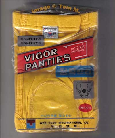 VIGOR PANTIES UPDATE! Recently (summer of '05 to be specific, since I probably won't get around to updating this for several years) there has been a groundswell of two emails received at the Vigor Panties Desk of The Jaded Gates Website. Here they are: Received Monday, June 27, 2005 11:50 AM: On a whim I did a Google on vigor panties and found only your website. My mother discovered them while Director of the USO in Seoul in about 1980 and found them amusing enough to negotiate the US rights to distribute them (with some major changes in design and marketing... the largest could not accommodate the average American!). We eventually met with the inventor to arrange a deal with a US distributor ...but he disappeared before anything could be finalized and we never heard from him again and potential investors lost interest. I gave many pairs away and at least one recipient who had been diagnosed as having a low sperm count due to testicles that easily overheated fathered a child after a few months of wearing them. I eagerly await my Vigor Panties, Mr. L.! For Tales from the Darkie Side, go HERE. Received Wednesday, July 13, 2005 7:53 PM: Hi Bruce, It is interesting to note that, according to Mr. L., a Google search on or before June 27, 2005, produced only The Jaded Gates as a source of Men's Vigor Panties lore, whereas via the same search by Mr. M. approximately two weeks later, The Jaded Gates was "one of the surprisingly few" results. Obviously, interest in Men's Vigor Panties is growing exponentially. And now, thanks to Mr. M.: HERE THEY ARE (only the yellow pair are shown, for obvious reasons): |